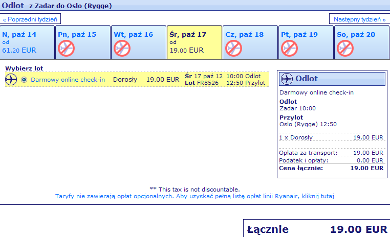 Całkowite koszty lotu zamykają się w 183 złotych i 53 groszach (wg. kursów z dnia 29.08.2012). Aby nie wzrosły o popierane przez przewoźników prowizje należy stosować zwolnione z opłat karty płatnicze. W Wizzair pomoże nam karta Citibank Wizzair, natomiast w Ryanair przyda się karta MasterCard Pre-Paid WBK.